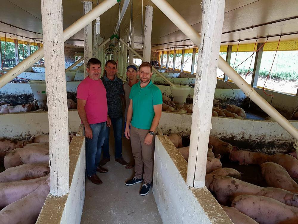 O prefeito Fábio Persch e o vice, João Weschenfelder, juntamente com o secretário municipal de Agricultura e Meio Ambiente, Volmir Hauser, visitaram nesta semana o novo pavilhão para criação de suínos construído pelo produtor Alberto Inácio Schmitz, em Nova Colúmbia, na parte norte do município. A estrutura, com cerca de 400 metros quadrados, foi construída com apoio da prefeitura e tem capacidade para abrigar 520 leitões por lote.